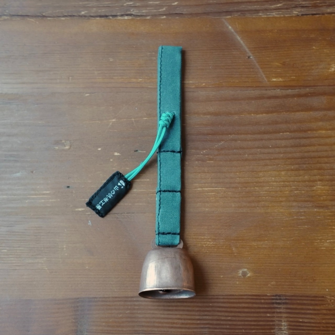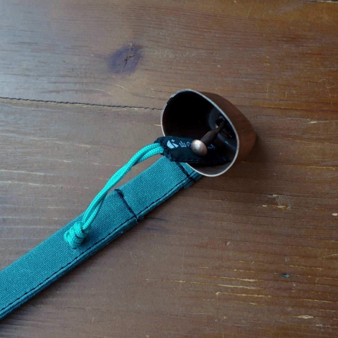 帆布で作られたストラップは、親指をひっかけて手に持ちながら行動する前提でデザインしています。ストックと一緒に持つ事ができ、鳴らしたいタイミングではしっかり音を出せます。