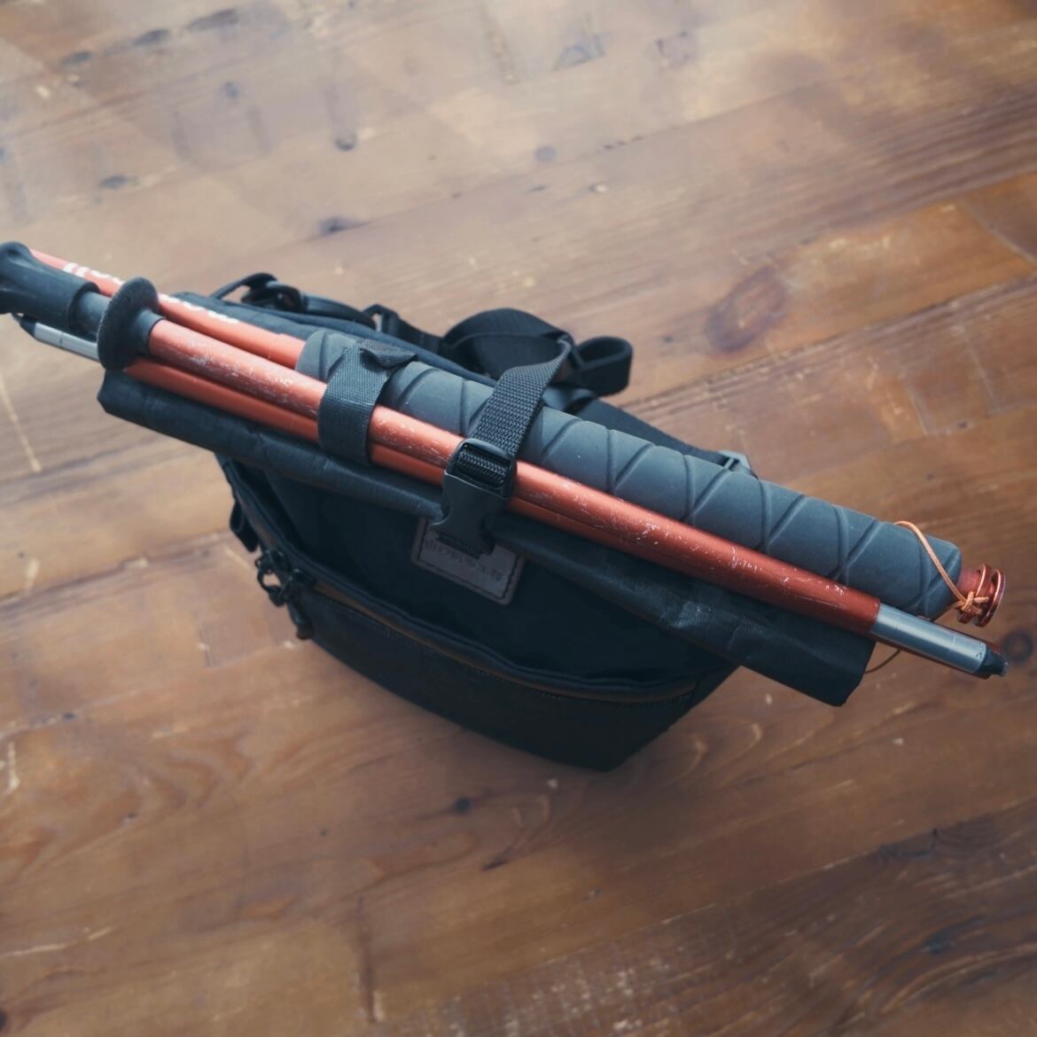 ショルダーストラップは取り外し可能で、本体のカラビナをザックに取り付けチェストバッグとしても使用できます。