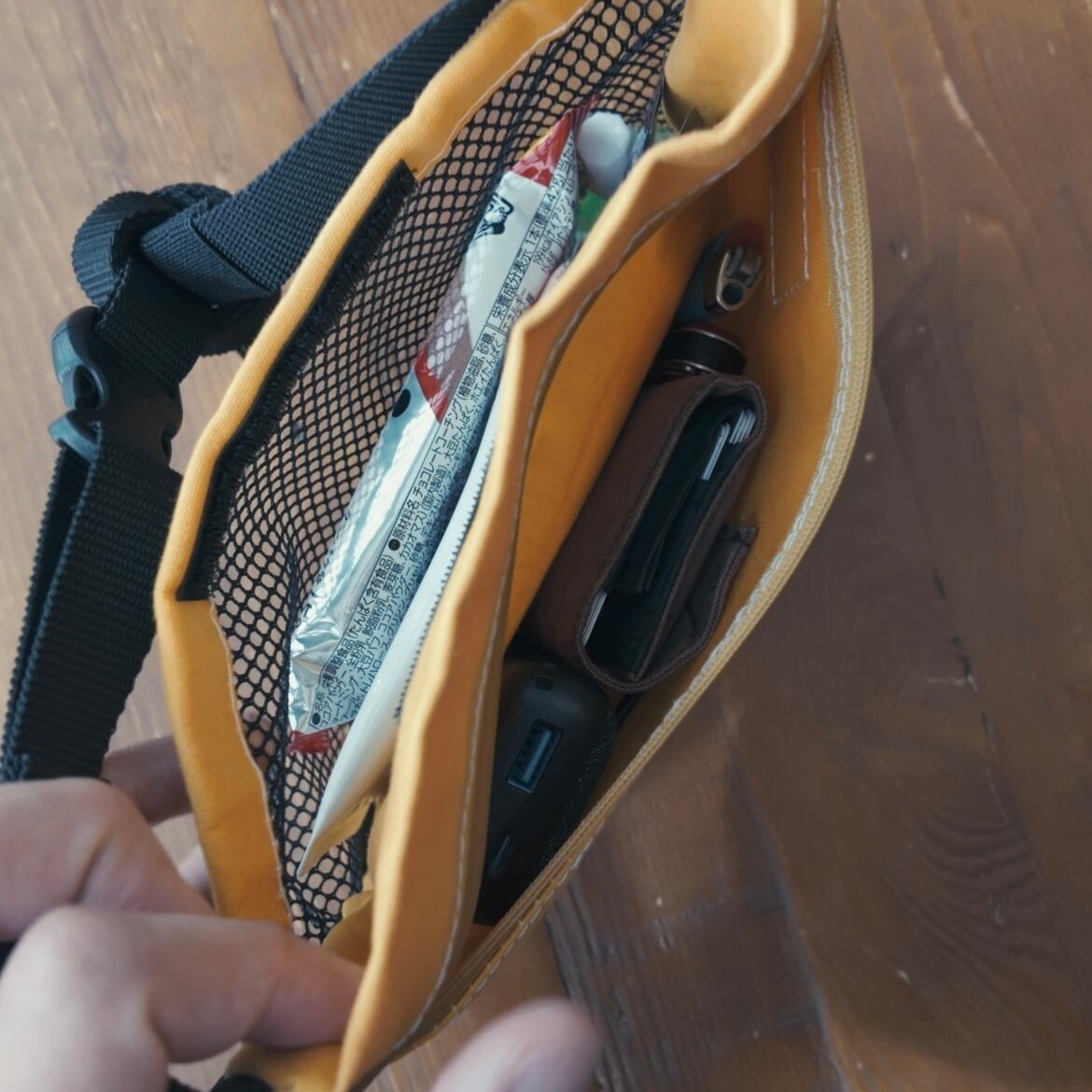 薄手の長財布が入る設計となっていて、アウトドアシーンでも日焼け止めや行動食、携帯等