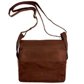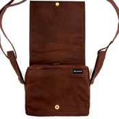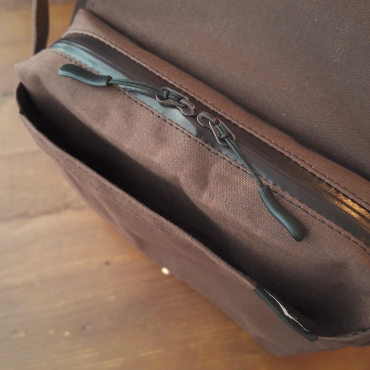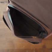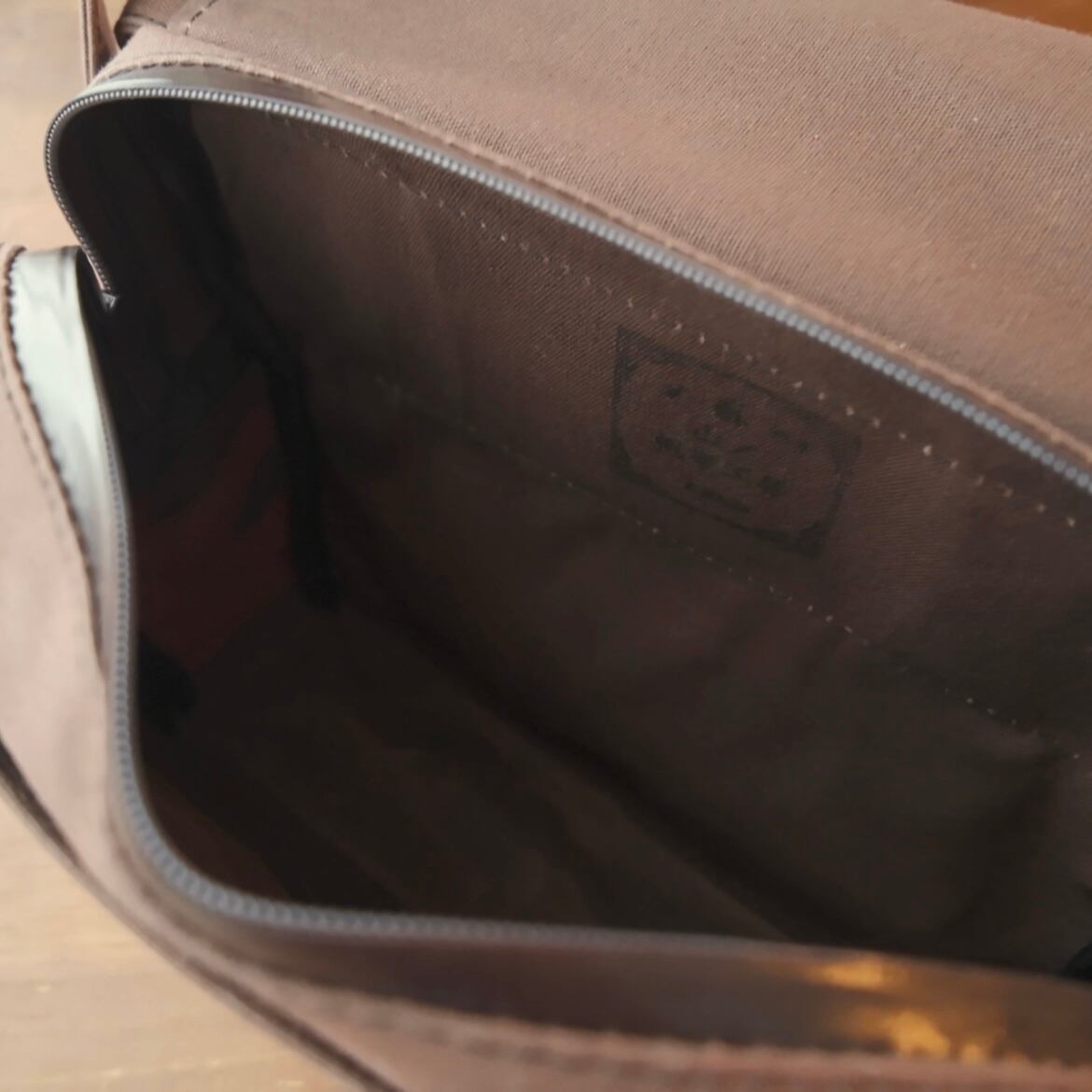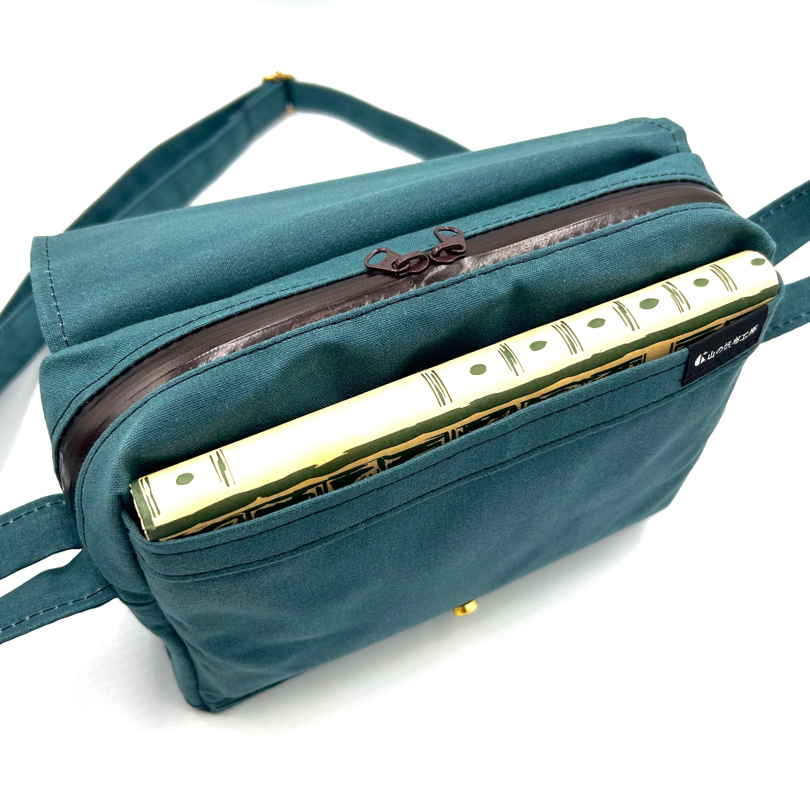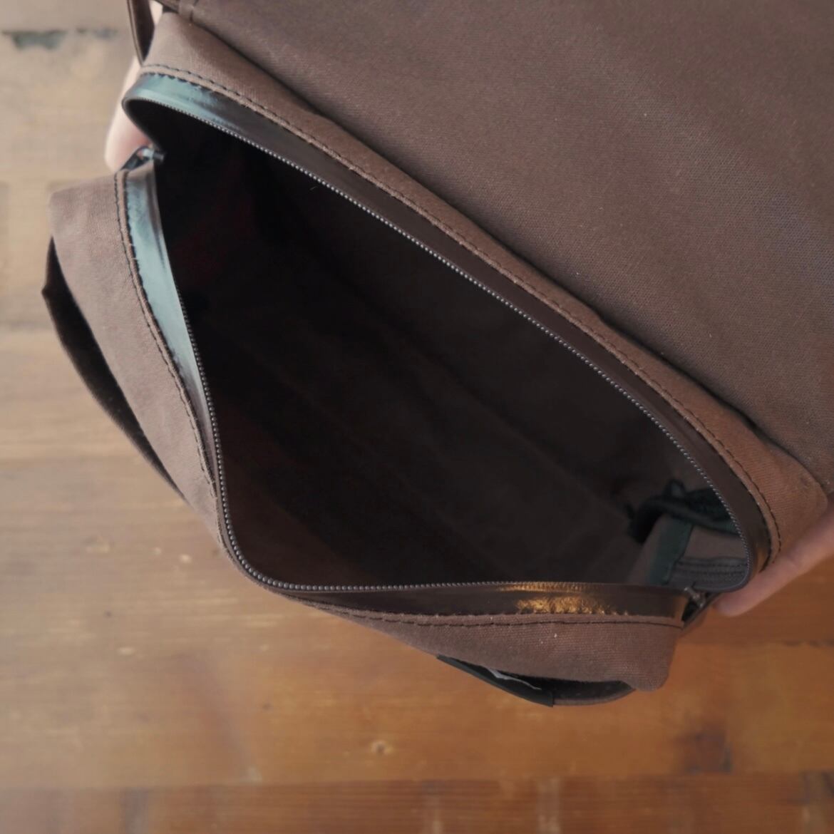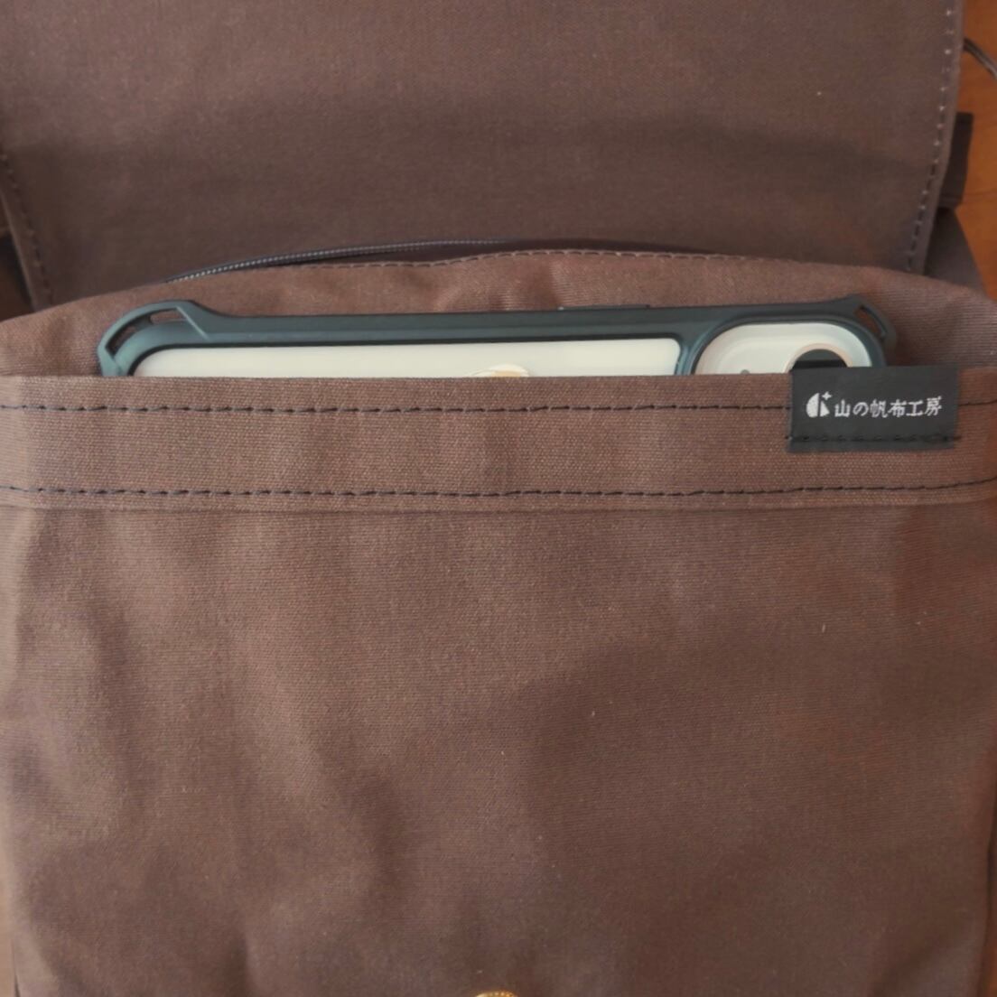 真鍮ボタンが付いた長めのフラップを開けると単行本(B6判)が入る収納力の大きめポケットがあります。