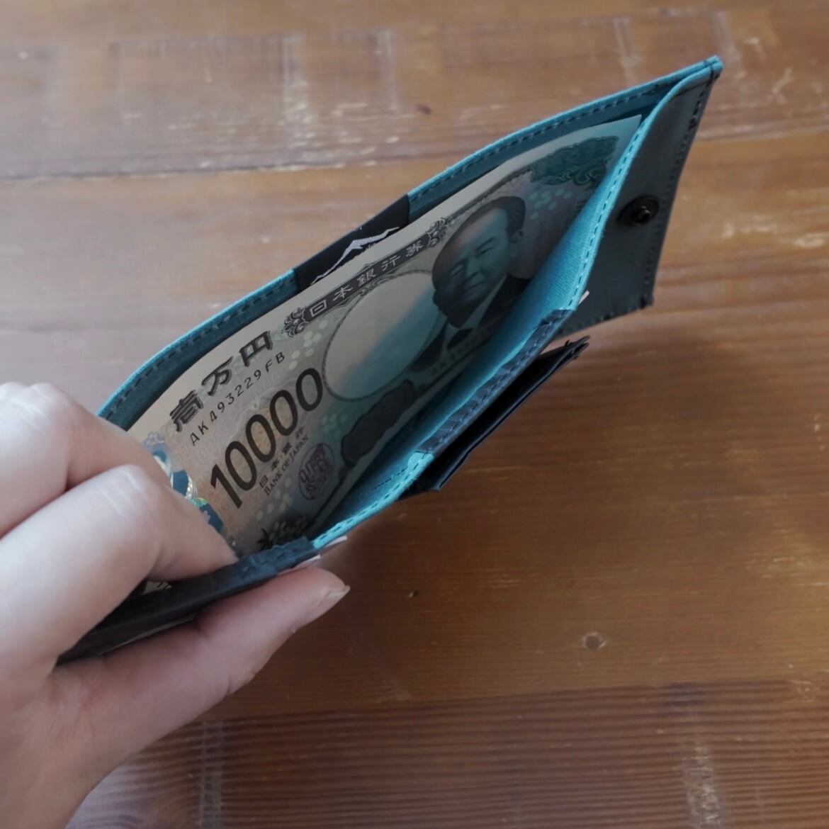 手の中に納まるスリムなデザインながら、カードは9枚、小銭は約10枚をしっかりと収納できる実用性が魅力、1万円札も折らずに収納可能。