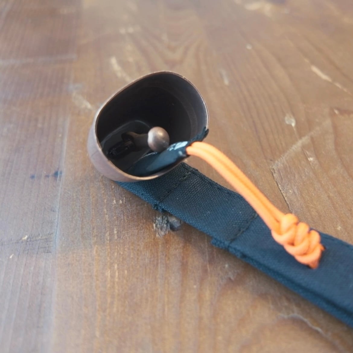 帆布で作られたストラップは、親指をひっかけて手に持ちながら行動する前提でデザインしています。ストックと一緒に持つ事ができ、鳴らしたいタイミングではしっかり音を出せます。
